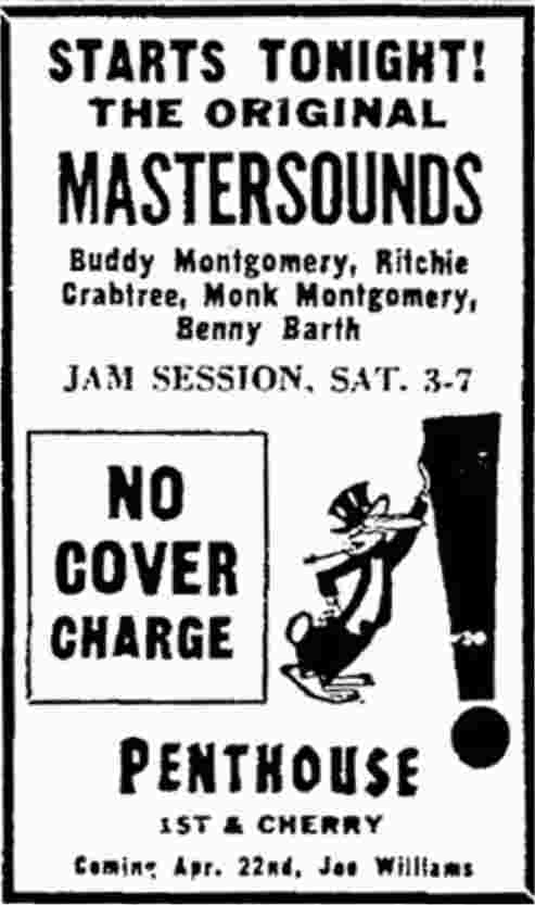 シアトルのペントハウスに「独創的なマスターサウンズ今夜出演」との新聞広告。